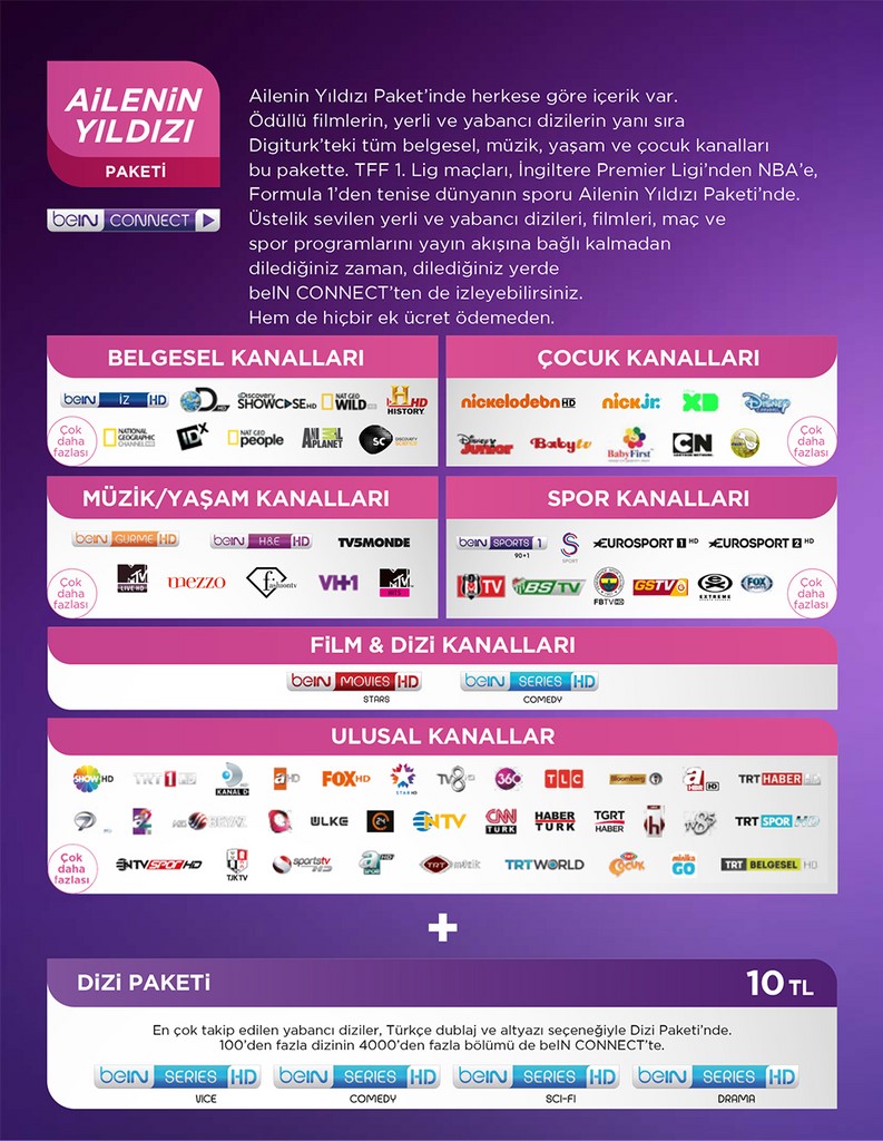Digitürk’teki TÜM belgesel kanalları, TÜM çocuk kanalları, TÜM yaşam-eğlence kanalları ve TÜM sporsever kanalları (60’tan fazla özel kanal) "Ailenin Yıldızı" paketinde.AİLENİN YILDIZI PAKETİ KAMPANYASI